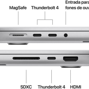 Portas: 3x Thunderbolt 4/USB-C (40Gbps), HDMI 2.1, SDXC, MagSafe 3, P2 3,5mm