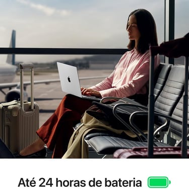 A Apple promete até 24 horas de uso de bateria. O notebook mantém o mesmo desempenho tanto ligado na tomada quanto na bateria, e oferece recarga rápida de 50% em 30 minutos com adaptador de 96W ou superior.