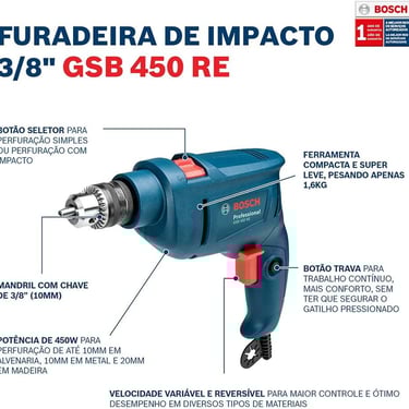 A Furadeira de Impacto Bosch GSB 450 RE, com potência de 450W, é a melhor escolha para quem busca a confiança da marca Bosch por um preço acessível. Com apenas 1,6kg, perfura alvenaria, madeira e metal, com e sem impacto, graças ao botão comutador.