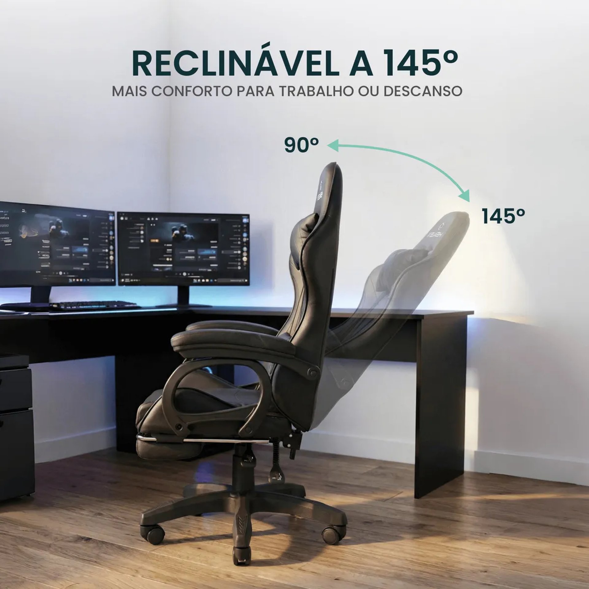 Combinado com a reclinação do encosto, o apoio de pés cria uma posição de descanso completa sem sair da cadeira — ideal para pausas entre partidas ou durante reuniões mais longas.