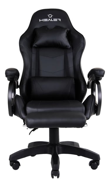 A Cadeira Healer Level tem estrutura em metal e plástico, com estofamento em couro sintético. As dimensões do assento são 47cm de profundidade por 48cm de largura, com altura do encosto de 74cm e altura total de até 126cm. O visual preto sóbrio e imponente combina com qualquer setup — de estações gamer mais elaboradas a simples mesas de home office.