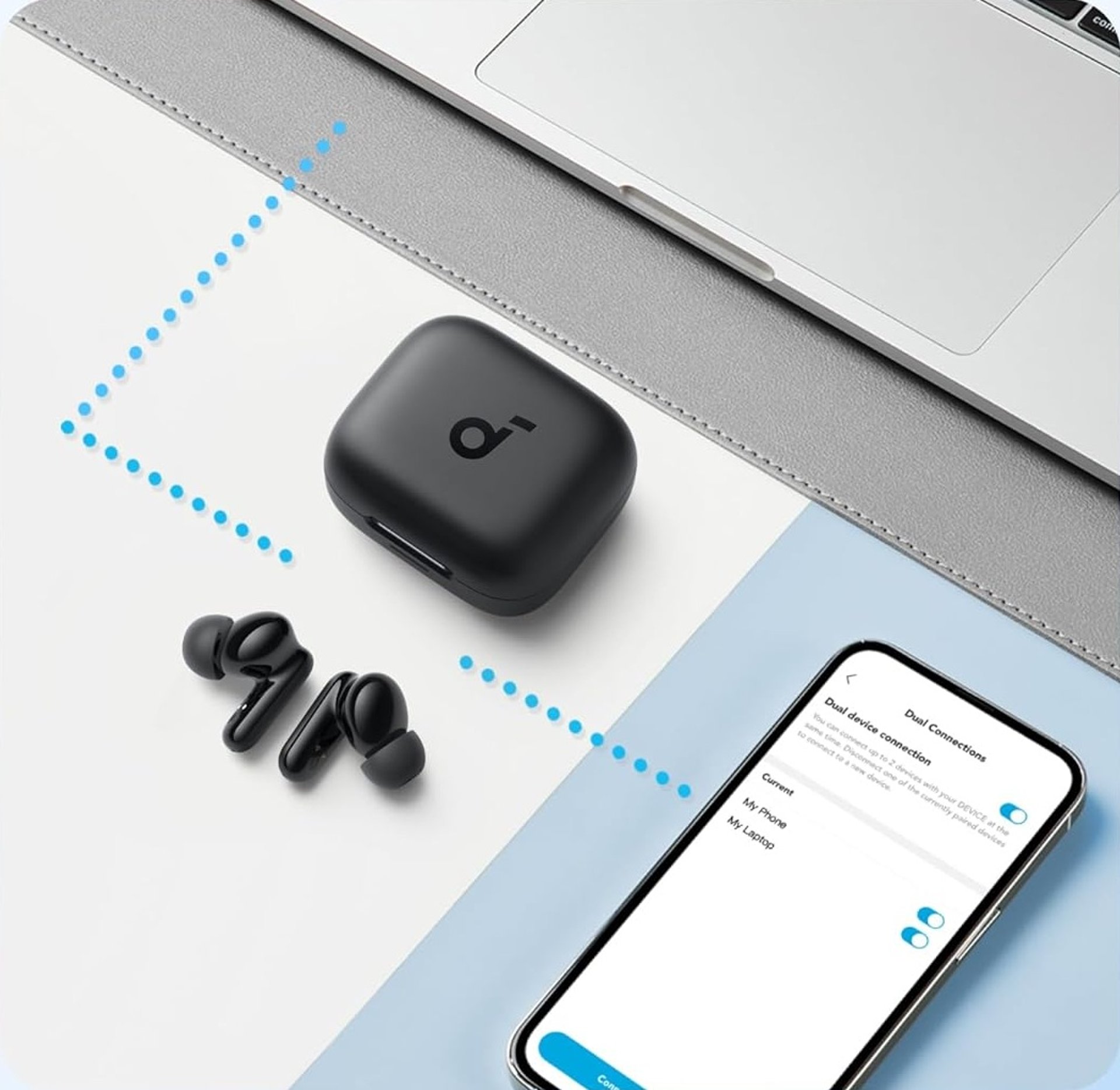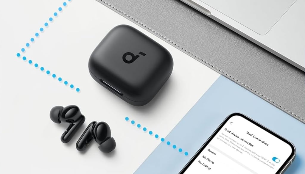 O fone conta com Bluetooth estável e conexão multiponto — permitindo conectar dois dispositivos ao mesmo tempo (ex: celular + notebook).