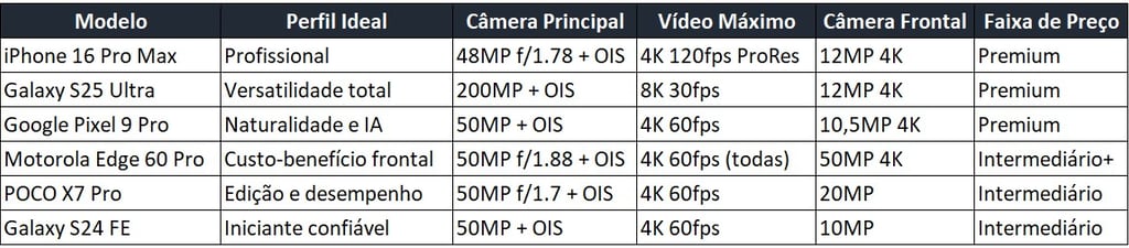 Em 2025, a barreira técnica para criar conteúdo de qualidade com smartphone foi praticamente eliminada. Do iPhone 16 Pro Max ao POCO X7 Pro, há opções sólidas para todos os orçamentos e tipos de conteúdo — cada uma com seus pontos fortes e seus perfis ideais de uso.