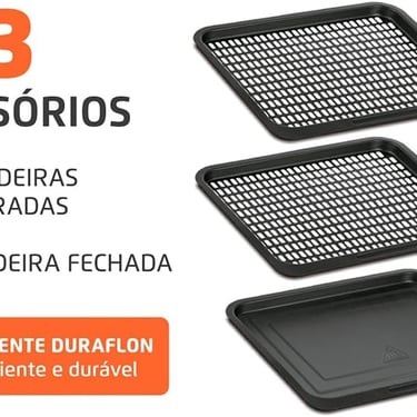 3 assadeiras antiaderentes inclusas — 2 perfuradas + 1 fechada para diferentes tipos de preparo